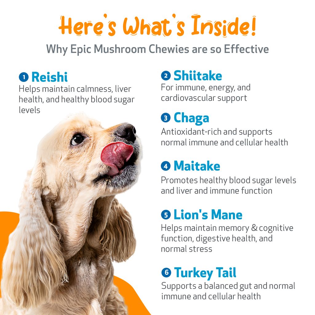 Our six-mushroom blend is rich in natural beta-glucans that strengthen your dog’s immune response. Every soft chew delivers targeted support to help fend off seasonal threats and keep your pup feeling their best. Made without wheat, corn, soy, or artificial preservatives, these chews are a clean and tasty way to reinforce natural defenses and maintain overall wellness.